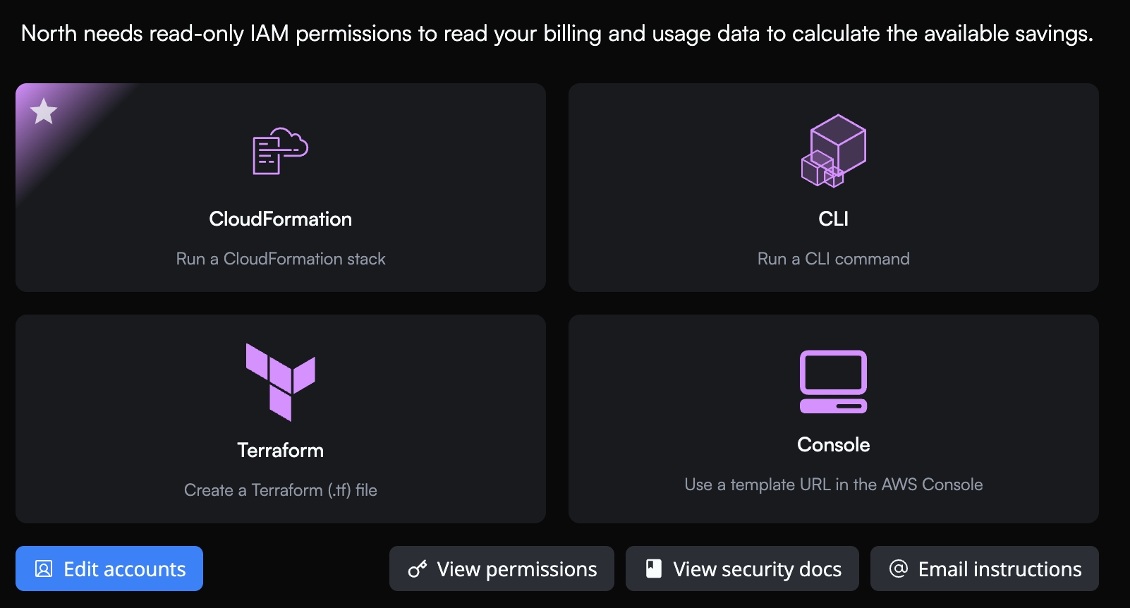 We recommend using the CloudFormation option. This deploys all the required permissions within a couple of minutes through a couple clicks. Or you can use Terraform, CLI, or console commands to deploy the required permissions.