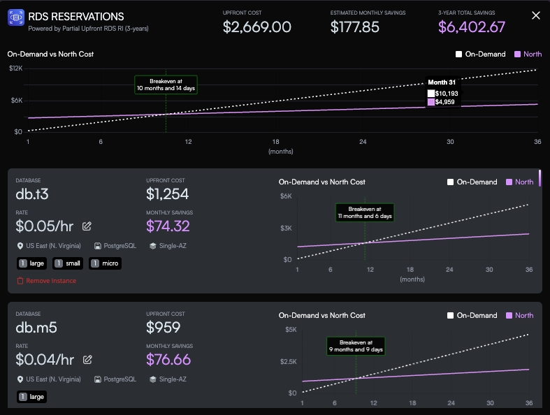 North will automatically analyze and show you TCO/breakeven statistics on each RI instance (total accrued costs vs On-Demand equivalent), both aggregated at the total account level, or broken down by individual service/instance type. To view, go to the checkout cart, Click DETAILS.