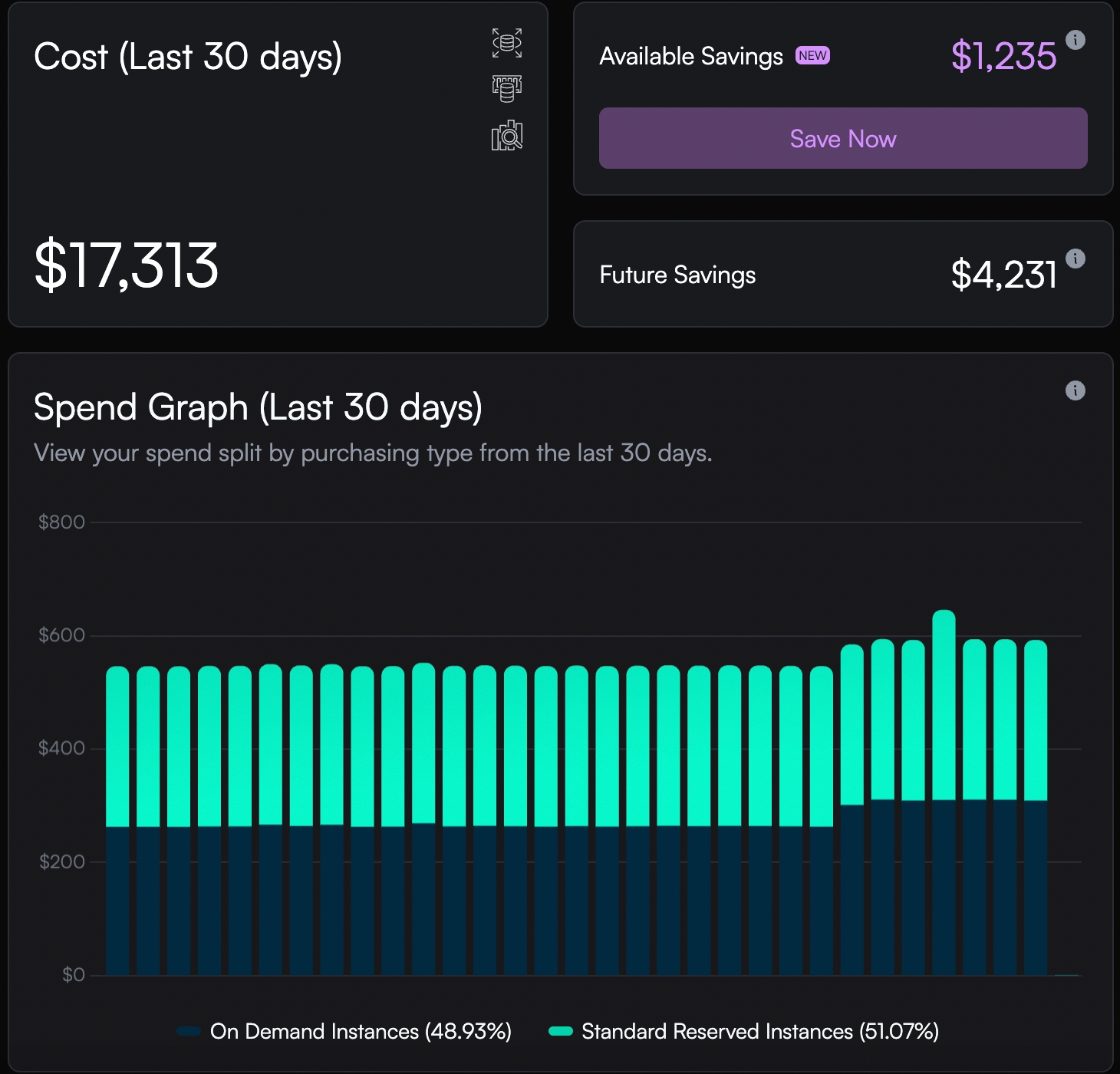 Spend Graph: offers a daily look at the compute spend by spend type (ondemand, reserved instances). Automatically showing the last 30 days.