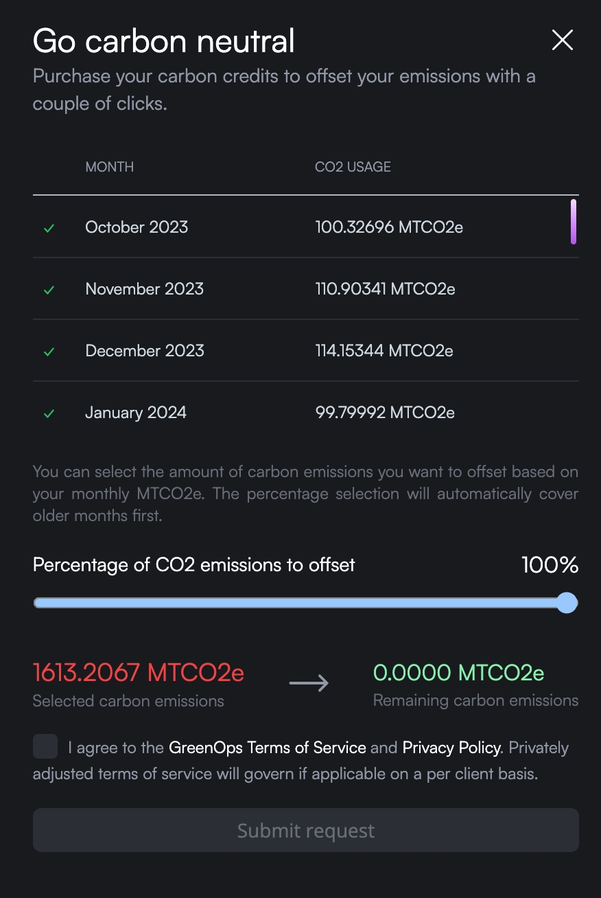 In order to request North purchase carbon offsets, please use the Go Carbon Neutral button at the top right, which will feature an authorization page allowing your to process the request with North. Please note that all receipts and a carbon neutral certification document can be provided upon request.