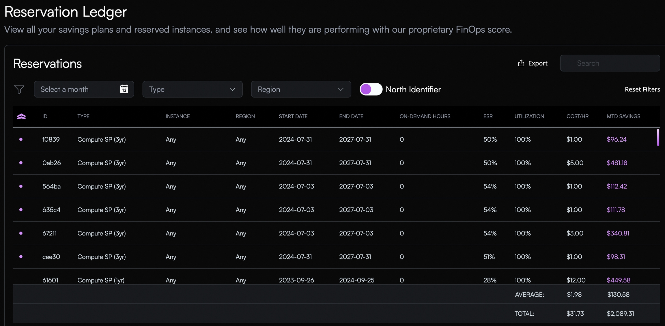 The ledgers offers a list of any reserved intances or savings plans (1 or 3 year) detected in your AWS organization. Flexible policies purchased via North will have a pink dot in the left hand colunm. You can view policy data, start/end dates, ESRs, utilization stats & MTD savings.