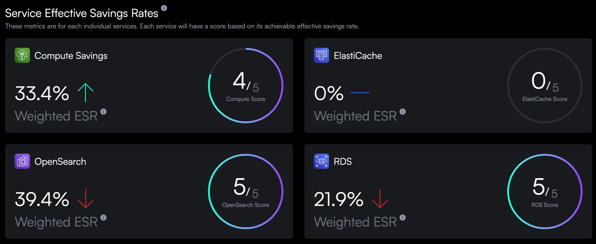 Scroll down to view your total account level finops score, ESRs per service. All scoring is weighed against the scale of potential ESRs available given AWS's pricing of the products & savings reservation systems in each product type.